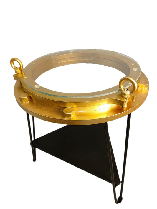 DRH - Nautical Wood Ship Porthole Table - Gold Color with Black Metal Legs - Round Accent Table for Beach House and Boats - Coastal Theme - Perfect as Coffee Table and End Table