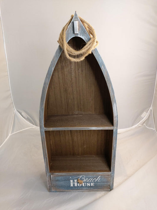 DRH - Nautical Distressed Wood Boat Shelf with Drawer - Standing Boat Shelf - Beach House Themed Ornaments - Boat Model Home Décor - Decorative Display Boat with Tropical Coir Rope