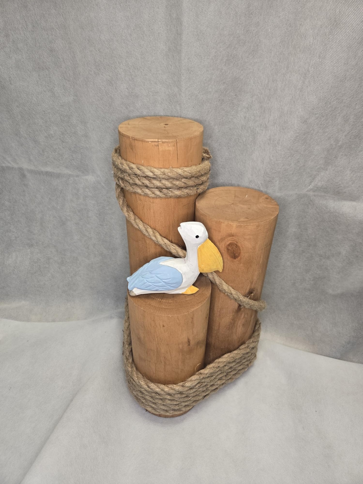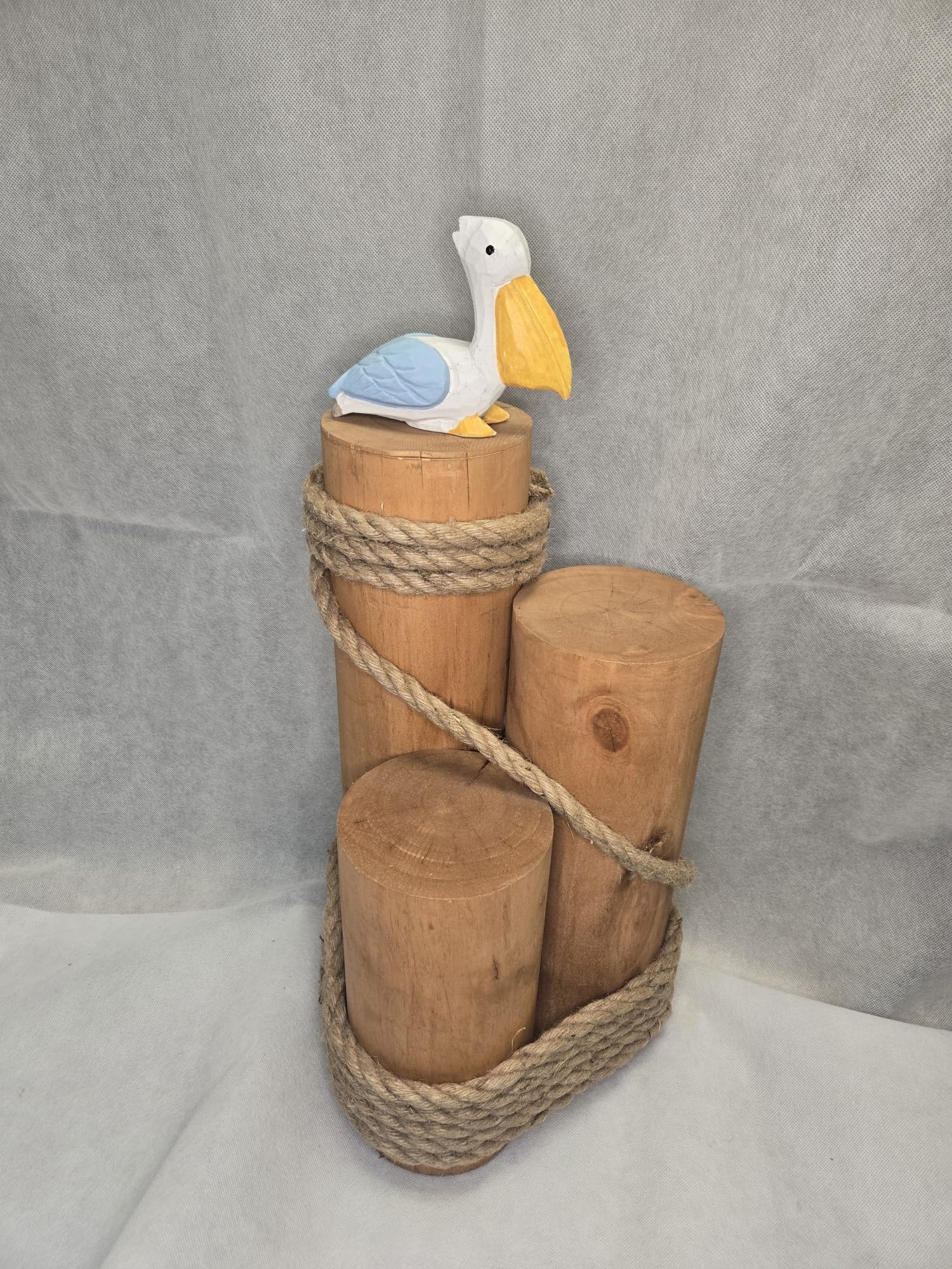 - Includes three pilings, each with a 5” diameter, securely tied together with durable 3 tier manila rope, and a loose 6" wood pelican, making them perfect for creating an impactful and cohesive nautical display. Would make a wonderful decor at home , office or Restaurant.