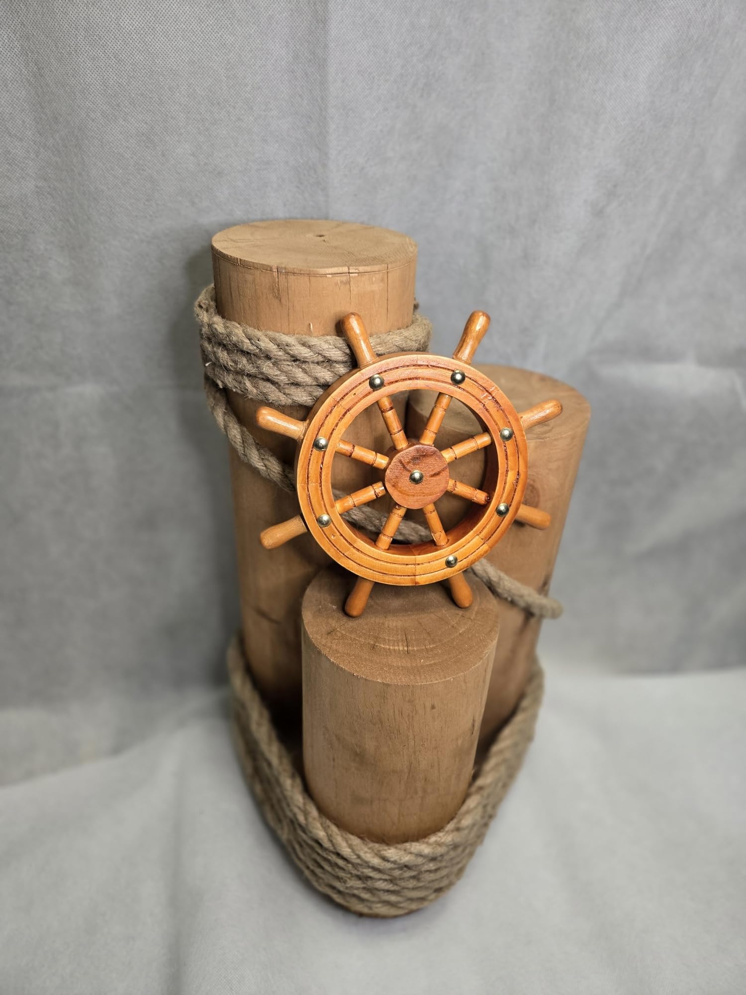 - Includes three pilings, each with a 5” diameter, securely tied together with durable 3 tier manila rope, and a beautiful loose 9" wooden shipwheel , making them perfect for creating an impactful and cohesive nautical display. Would make a wonderful decor at home , office or Restaurant.